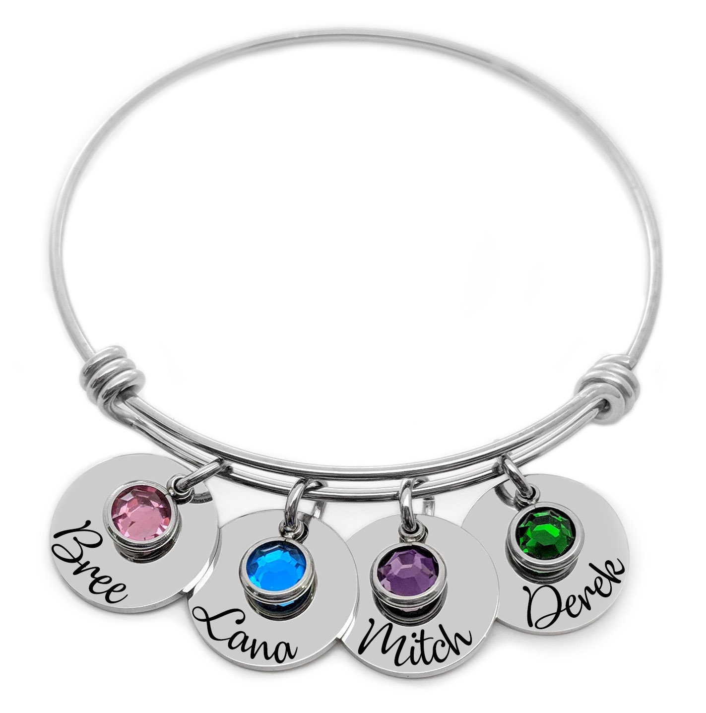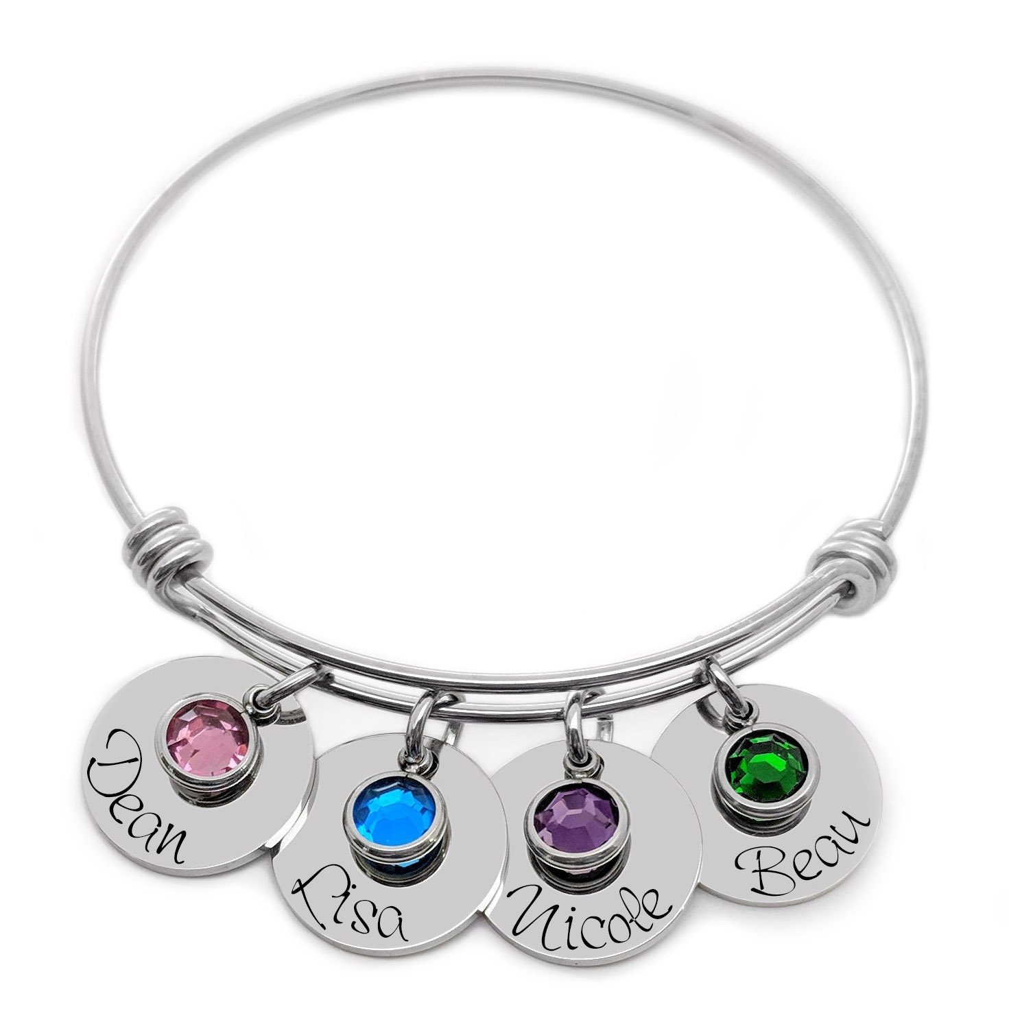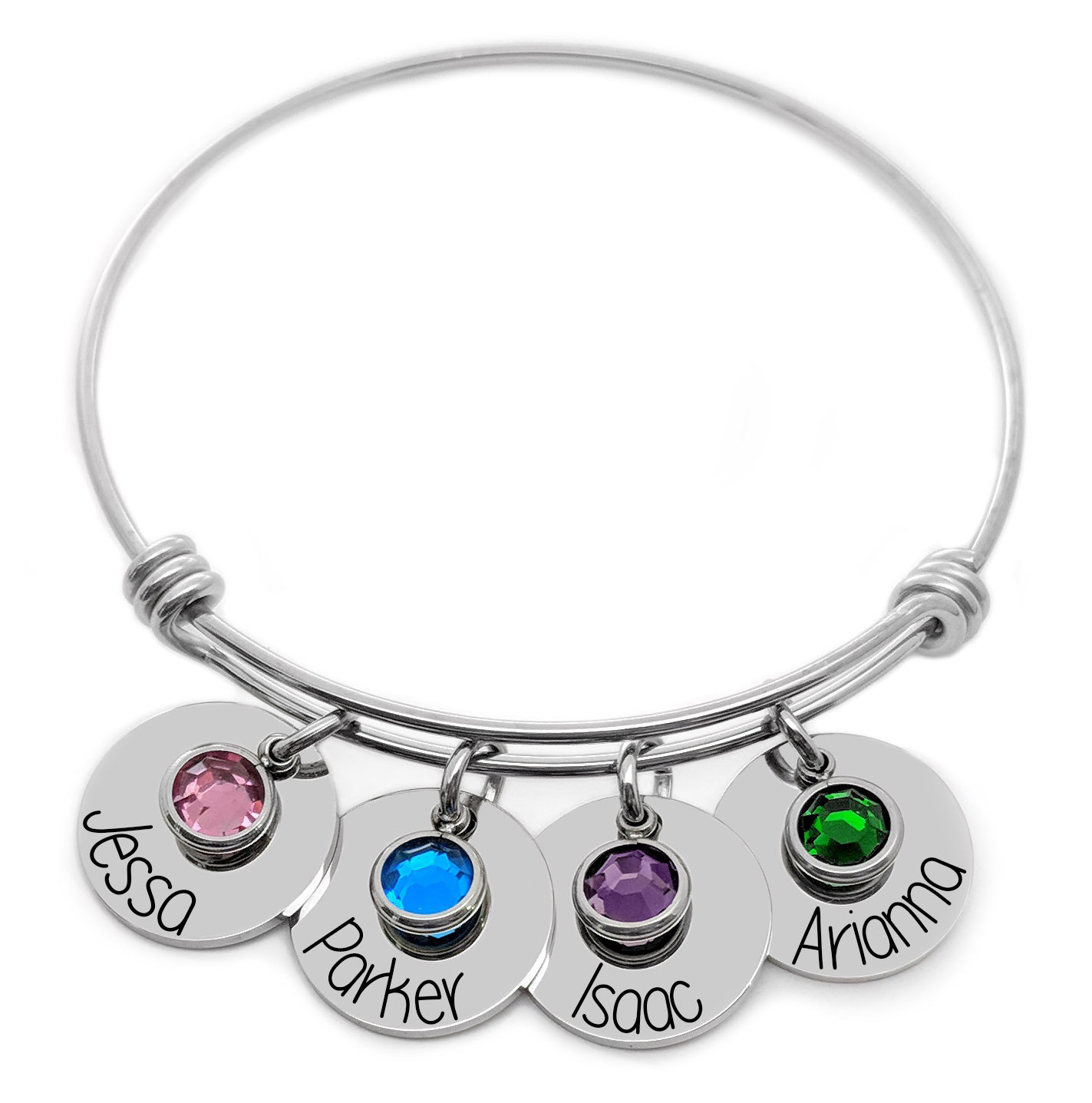 Celebrate motherhood with a timeless, custom piece. This personalized birthstone mother’s bracelet is hand-crafted from stainless steel (rust & tarnish resistant, hypoallergenic). It features 1–9 engraved discs, each paired with a birthstone crystal, so you can commemorate each child on a bracelet mom will treasure forever.