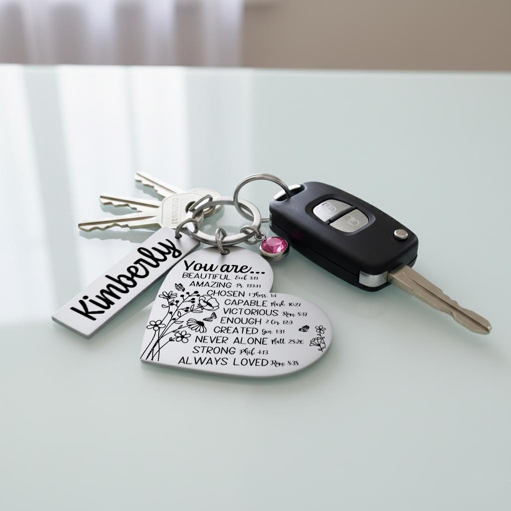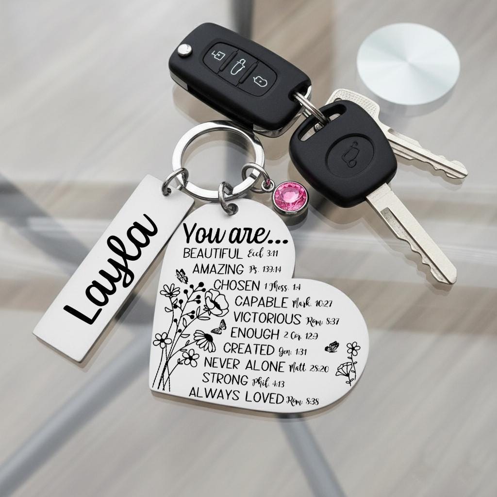 Carry a daily reminder of love and faith with this meaningful custom keychain. Crafted from durable stainless steel, the heart pendant is engraved with an inspirational Bible verse of your choice, paired with a personalized name tag and a sparkling birthstone crystal.