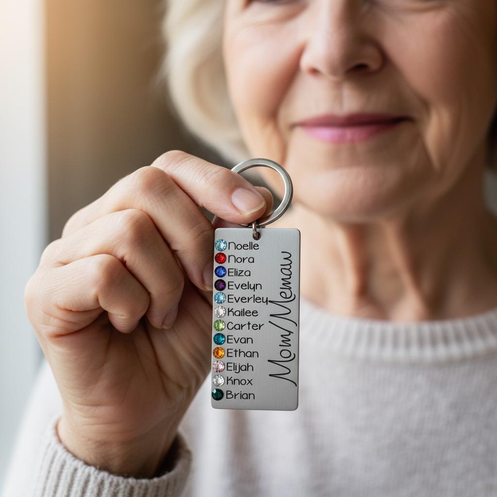 Celebrate the love of family with this Personalized Birthstone Keychain. Custom engraved with any name (Grandma, Nana, Mimi, Gigi, Mom, or your special title) and up to 12 kids’ or grandkids’ names, each paired with a sparkling birthstone charm.