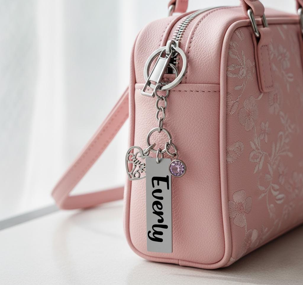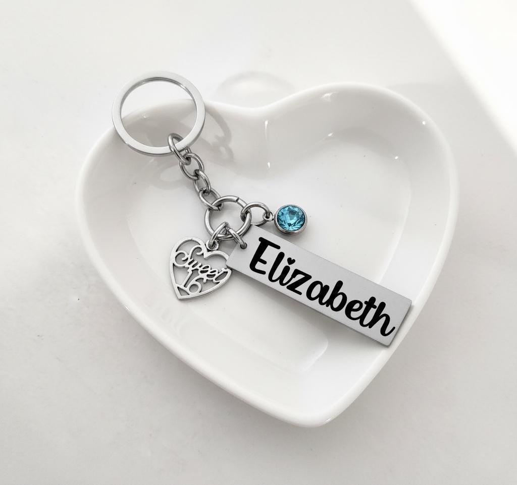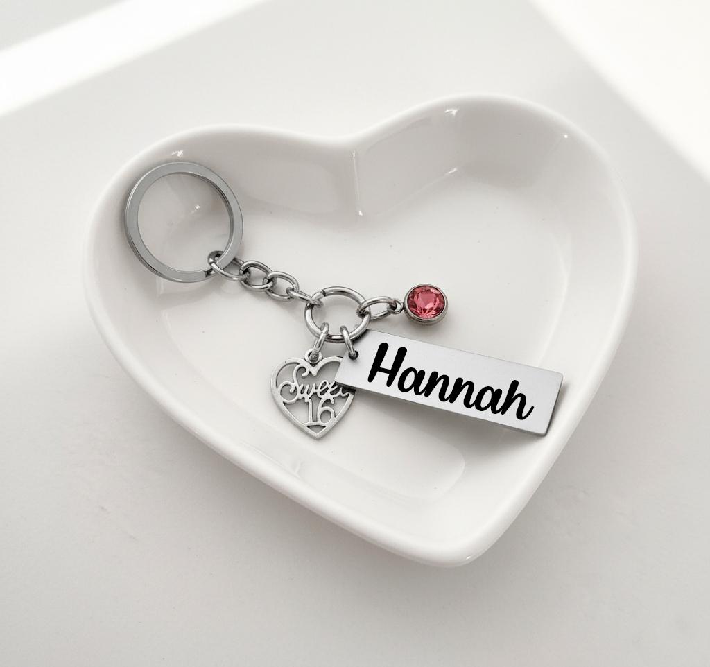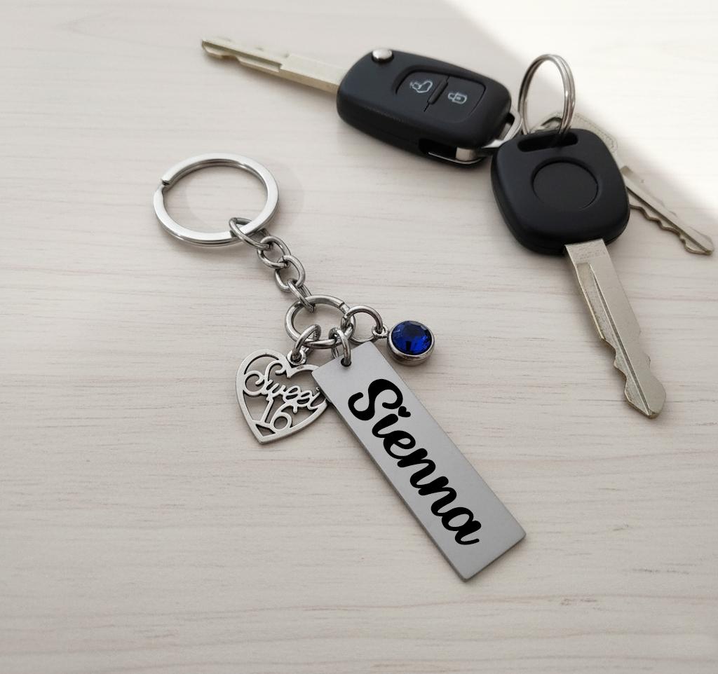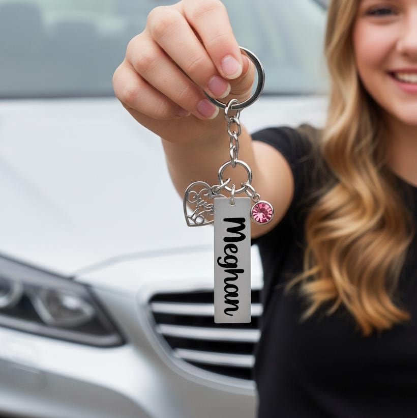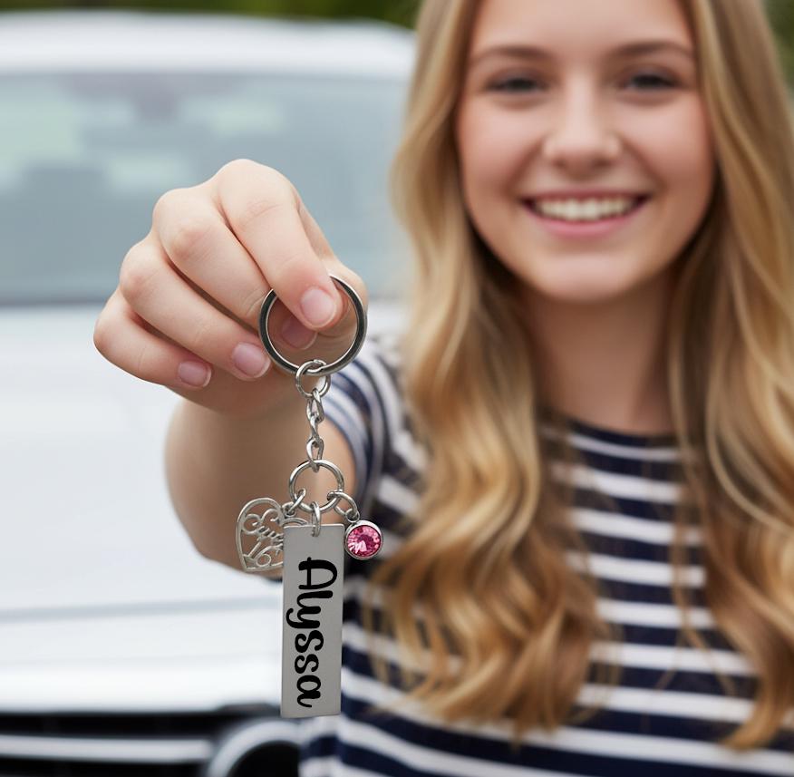 This custom keychain features a Silver “Sweet 16” charm, a stainless steel name tag, and a birthstone crystal of her choice. You can even opt for an optional back engraving to make it extra special. Perfect for a birthday gift, new driver, or milestone keepsake.