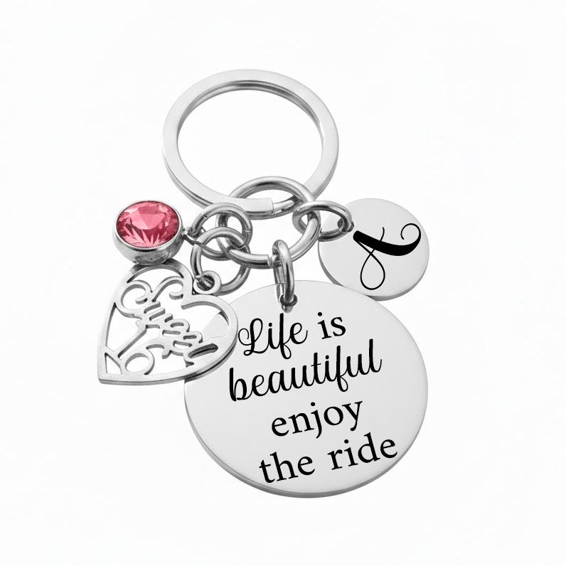 The keychain features a 1.25" round stainless steel pendant engraved with the uplifting message: