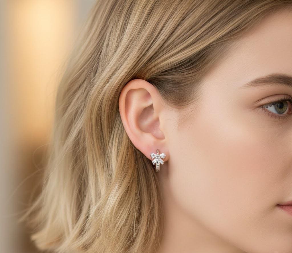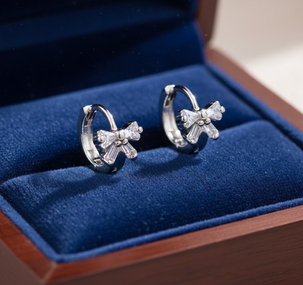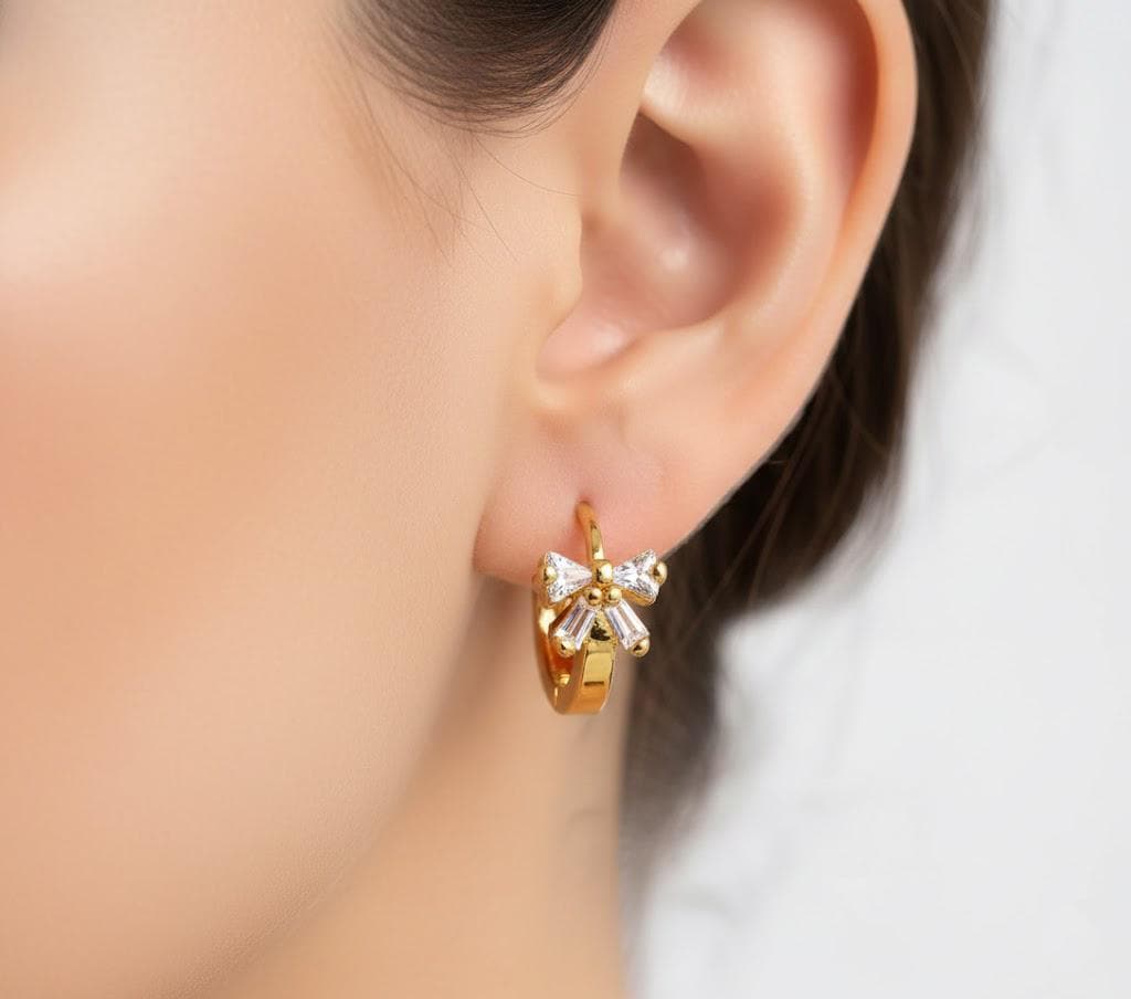 Add a touch of sparkle and sweetness to your everyday look with these elegant bow hoop earrings. Designed with a delicate zircon bow detail and a sleek huggie-style hoop, these earrings strike the perfect balance between feminine charm and modern simplicity.
