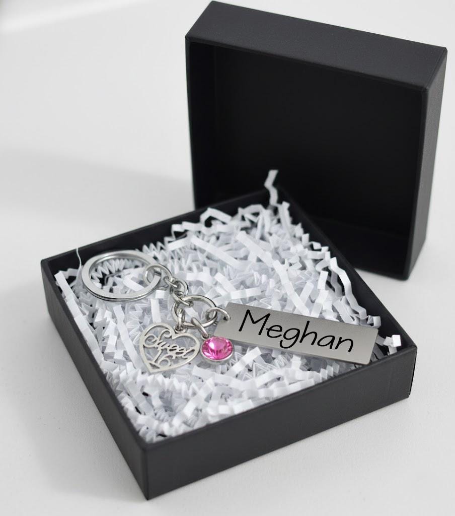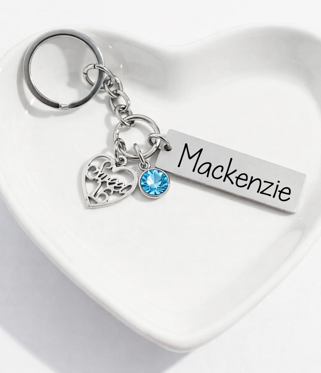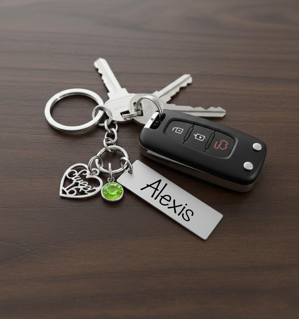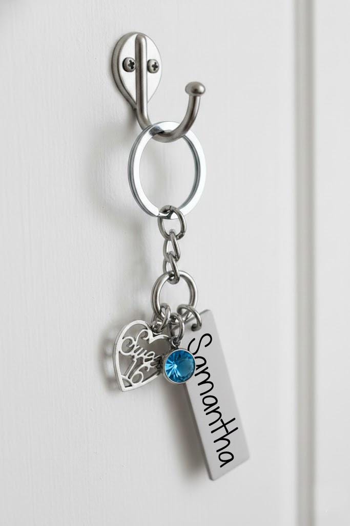 Make her Sweet 16 unforgettable 🎉 with a custom personalized keychain she’ll carry everywhere! This handcrafted keepsake is engraved with her name and features a sparkling birthstone charm — a perfect gift for a Sweet 16 birthday, first car keys, or teen party favor.
