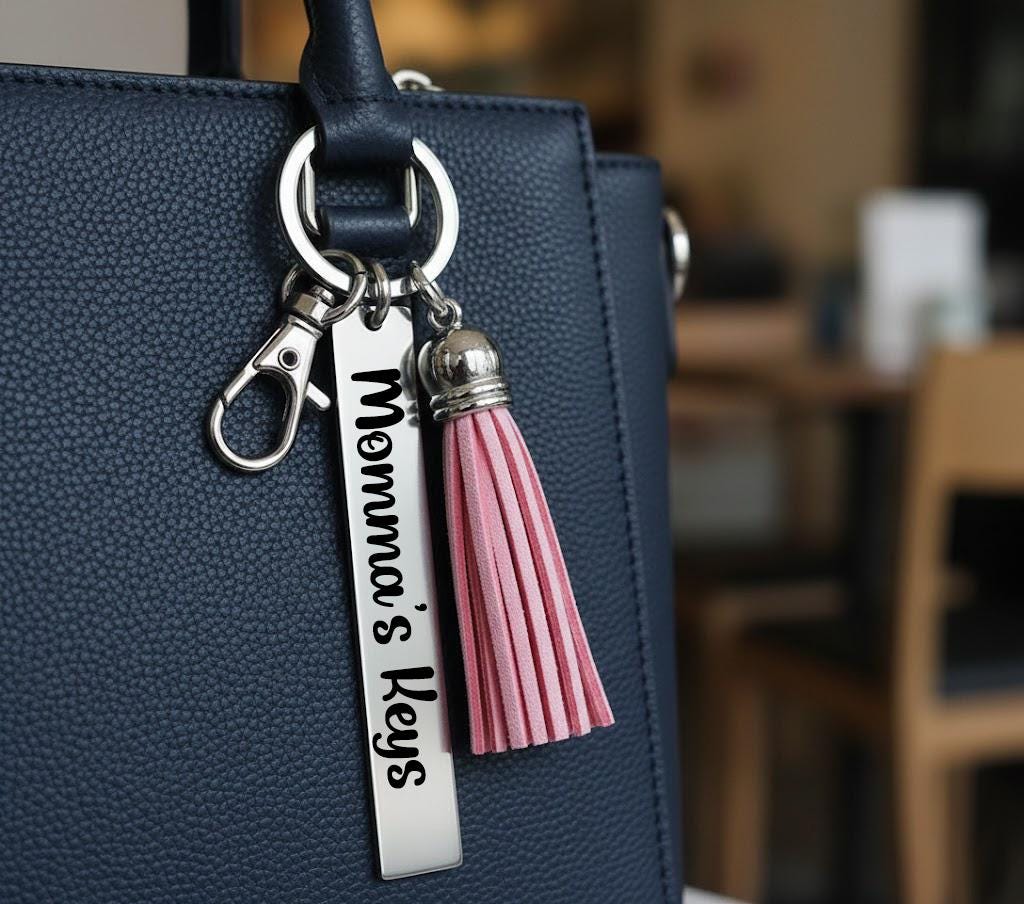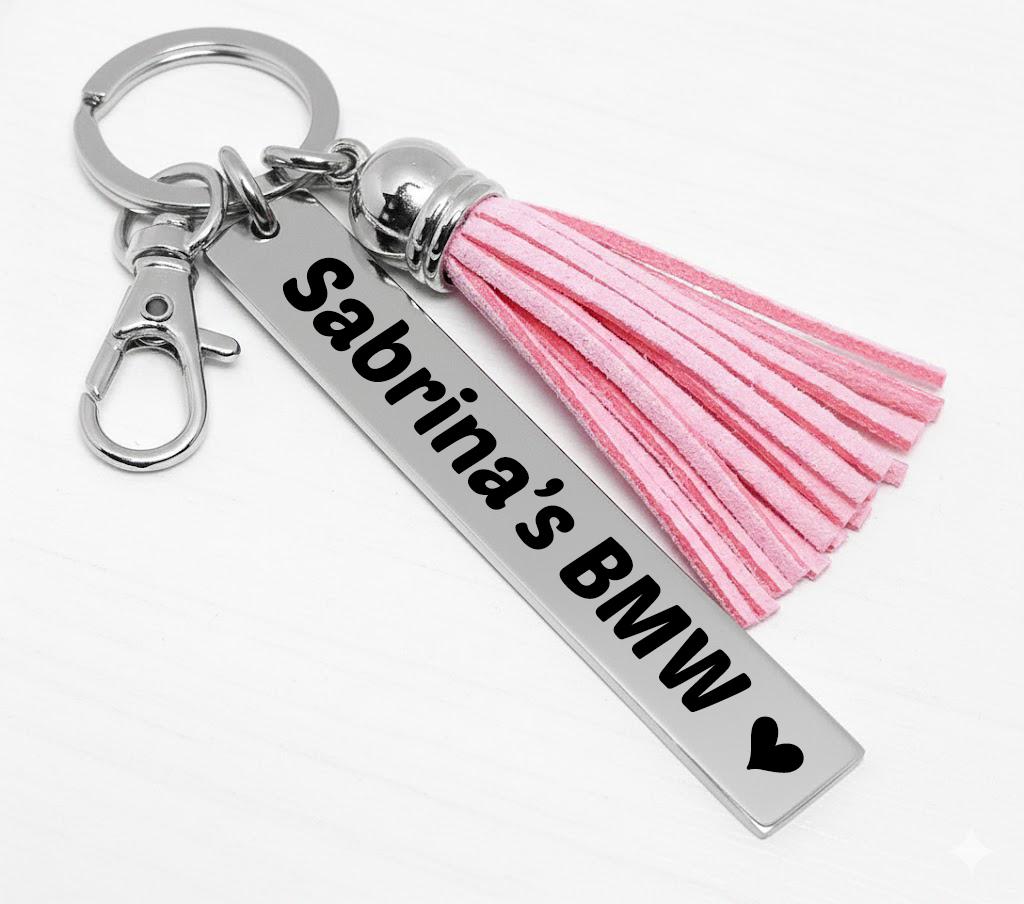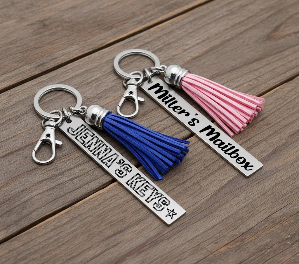 Add a personal touch to your everyday essentials with this custom name tassel keychain. Made with a soft faux leather tassel and a durable stainless-steel engraved tag, this keychain is both stylish and meaningful.
