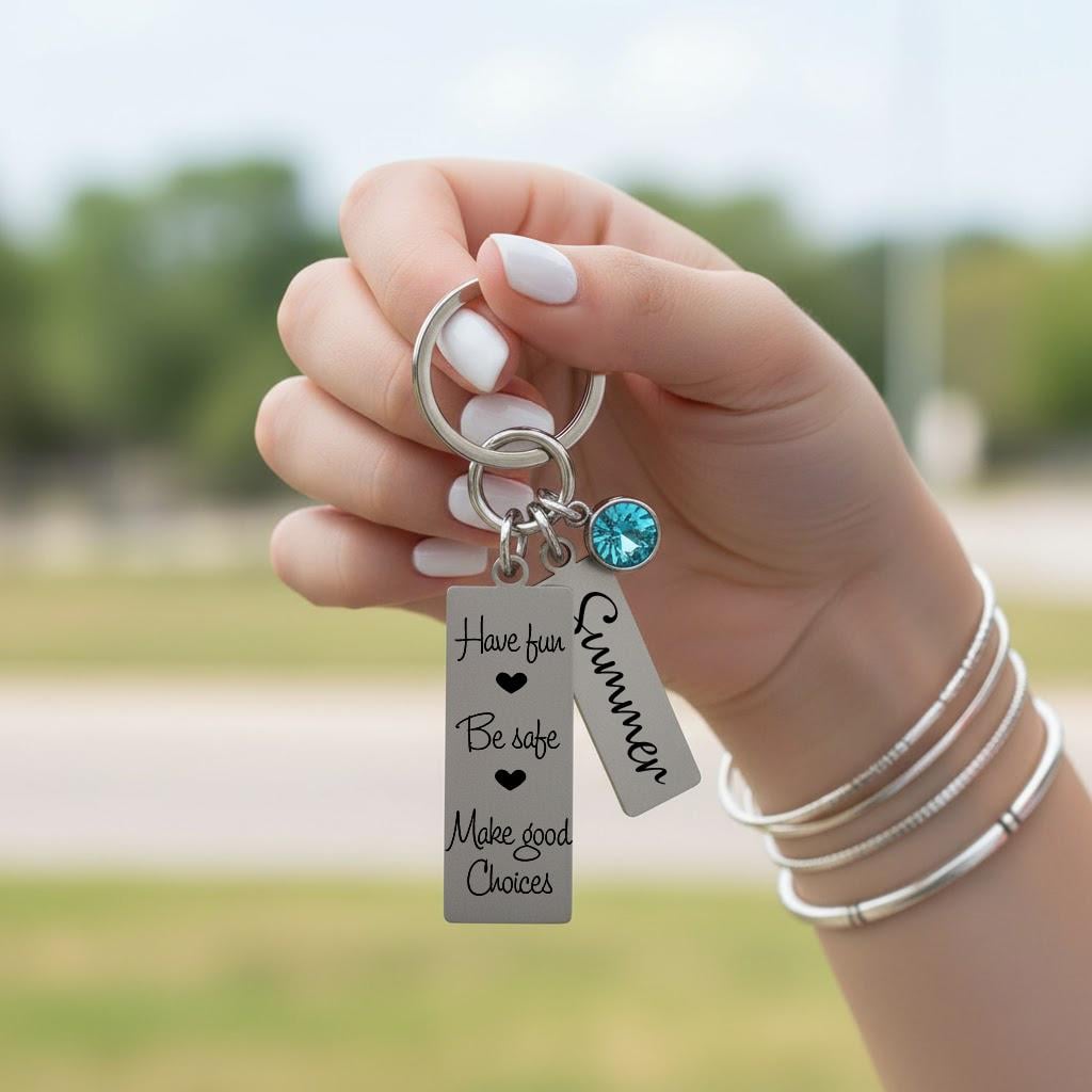 Personalized with any name and birthstone! This key chain makes a great gift for that sweet 16th (or any!) birthday. It comes complete with a stainless steel rectangle engraved with one of four sayings, stainless steel name tag, and 1 chunky birthstone crystal.