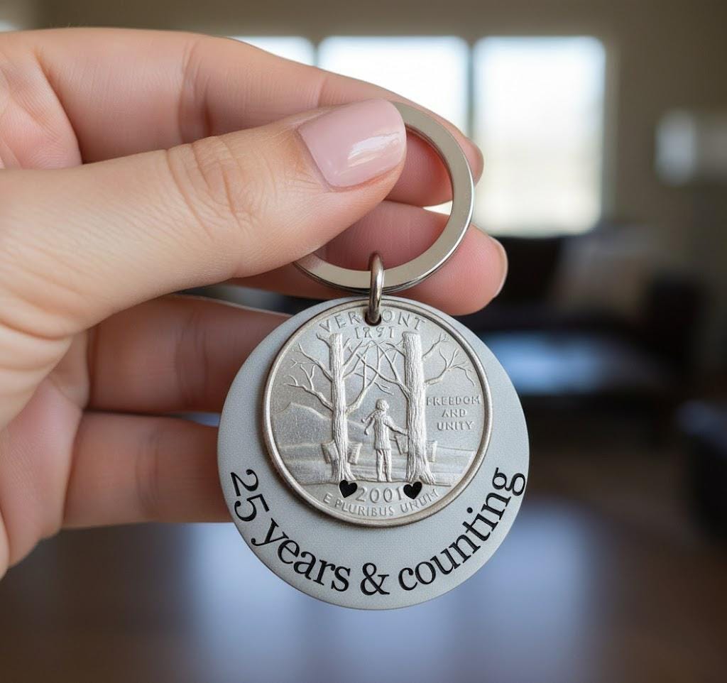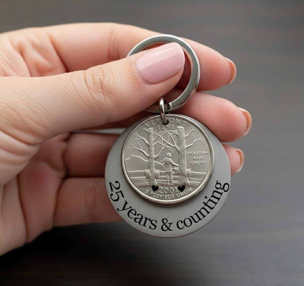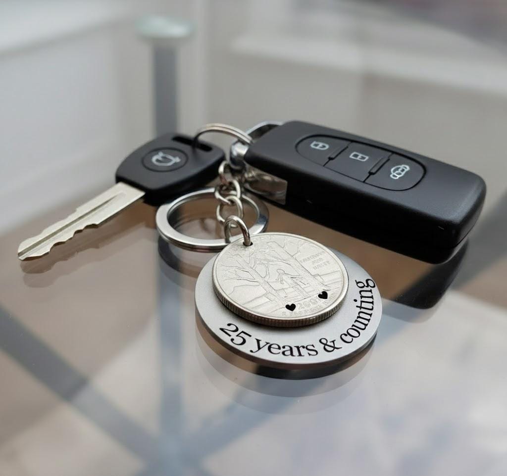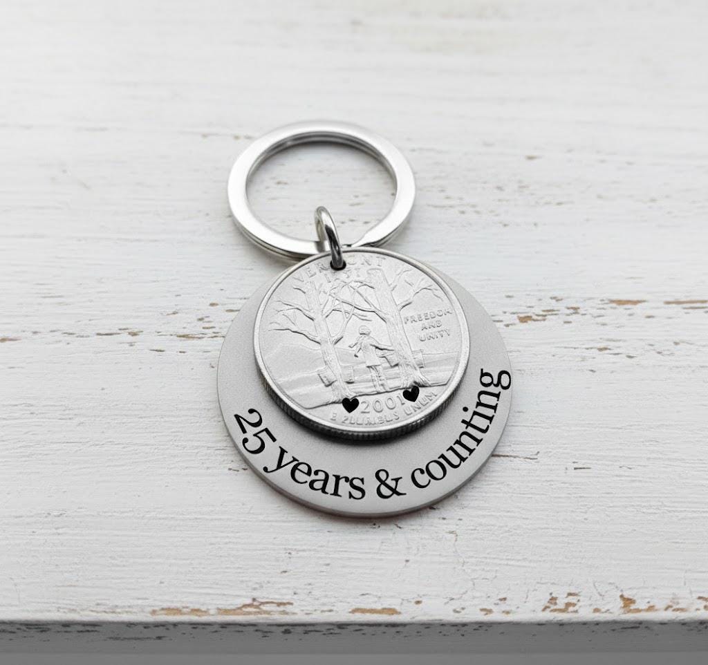 The 25th Anniversary Keychain makes the perfect, unique gift for that special day. The personalized engraving on the back makes it extra custom for a one of a kind item.